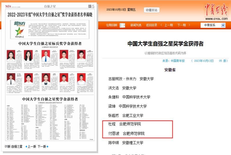 10月13日,2022年度“中国大学生自强之星”奖学金获得者名单正式揭晓,必赢官网文学院付恩波、杜程同学获评“中国大学生自强之星”荣誉称号。