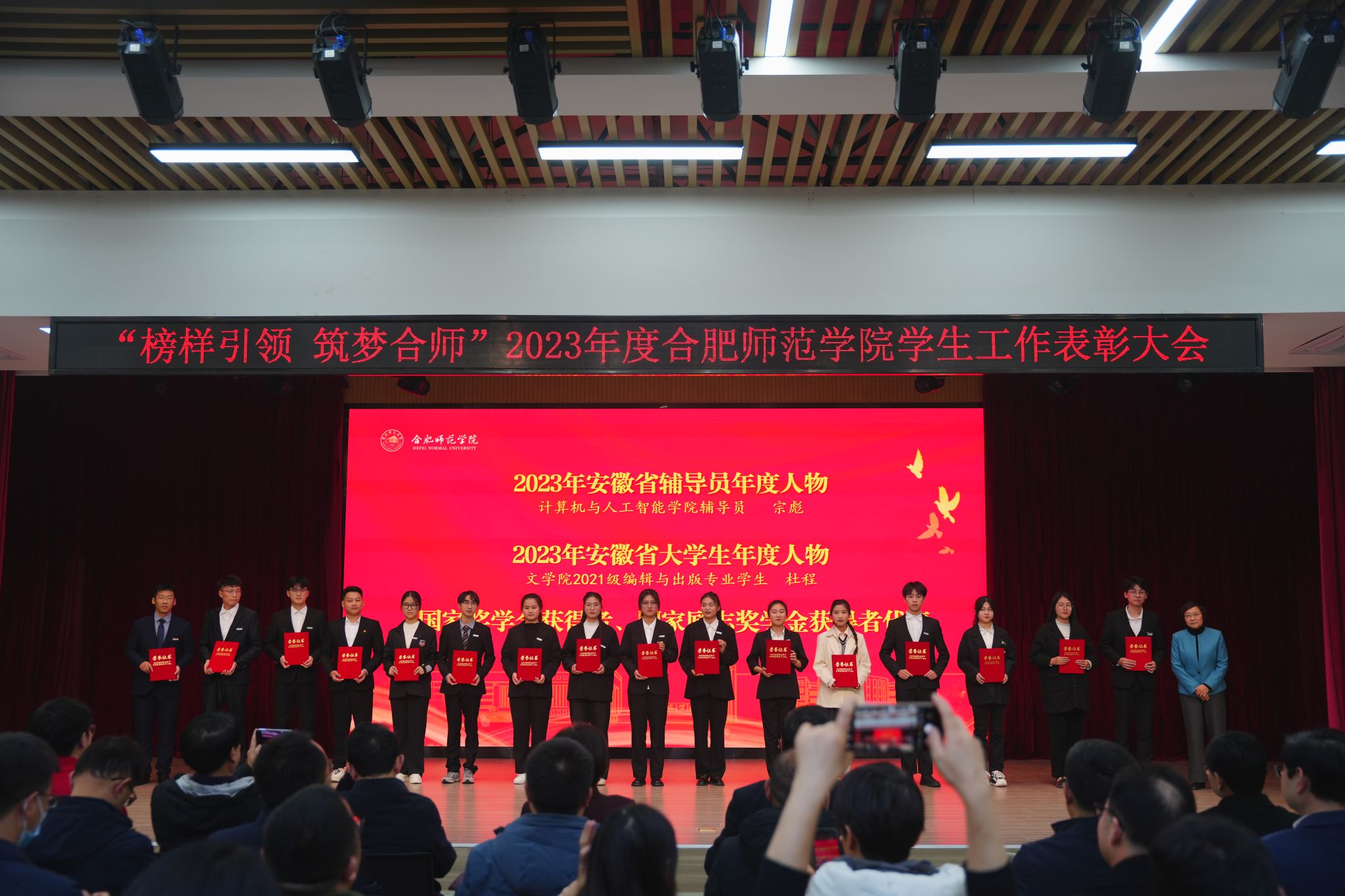 徐成钢为第三十一届世界大学生运动会奖牌获得者颁奖,方东玲为第十九届亚洲运动会奖牌获得者颁奖,梁立昌为2023年度安徽省辅导员年度人物、安徽省大学生年度人物获奖者及国家奖学金、国家励志奖学金获奖者代表颁奖,徐文林为入选安徽省纪委监委第三届“廉洁文化精品工程库”作品创作者颁奖,赵帮恚为学院2022年度优秀辅导员颁奖,常树宝为学院2023年廉洁文化作品征集活动优秀组织奖颁奖。现场还为学院2023年度廉洁文化作品征集活动获奖师生,2023年度十佳优良学风班级、十佳优良学风宿舍、十佳优良学风个人,第二十八届大学生科技文化艺术节优秀组织奖、组织奖和“十佳活动”进行了颁奖。