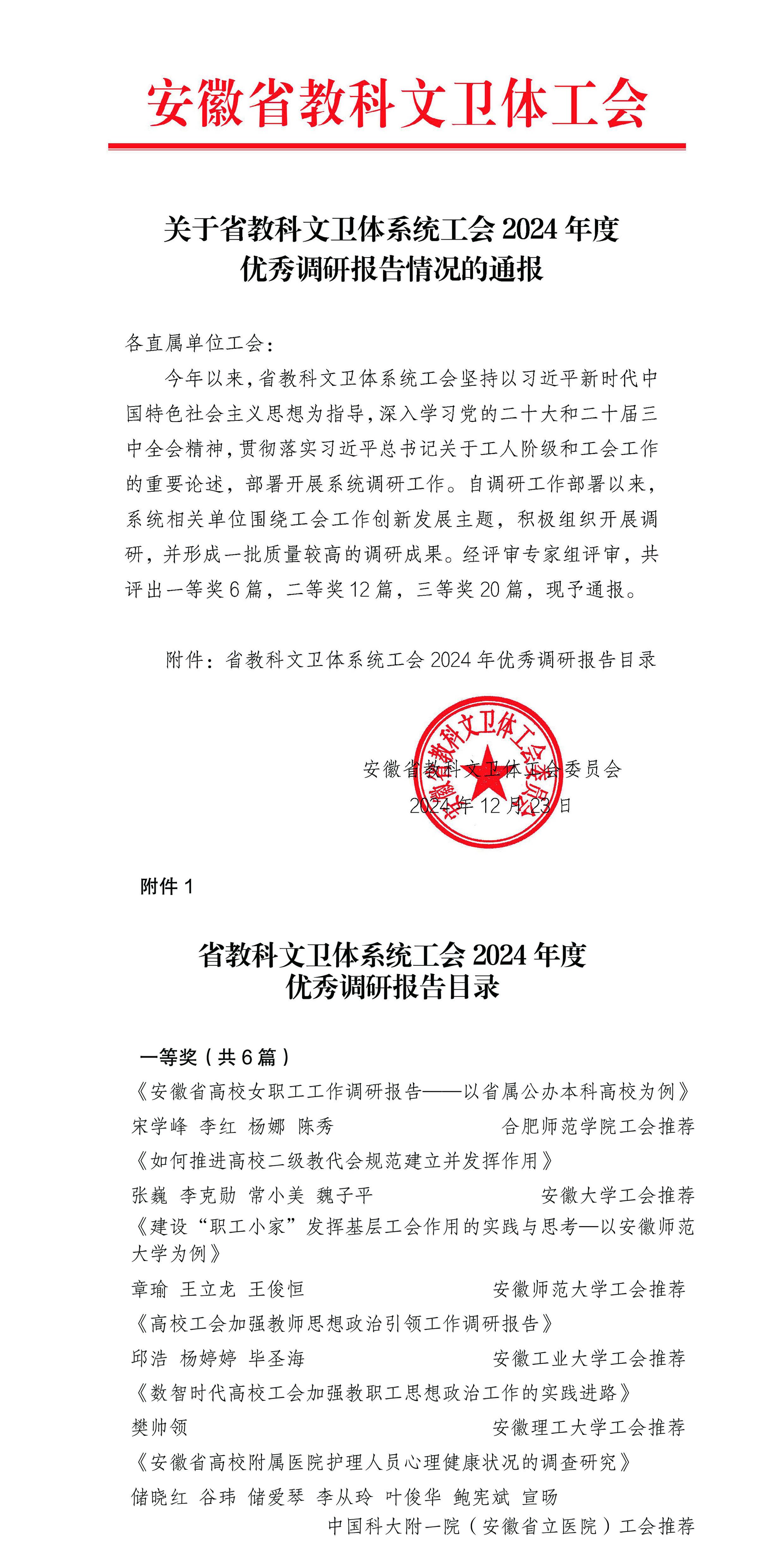12月23日,2024年度安徽省教科文卫体系统工会发布优秀调研报告情况,必赢官网宋学峰、李红、杨娜、陈秀撰写的《安徽省高校女职工工作调研报告---以省属公办本科高校为例》喜获一等奖。
