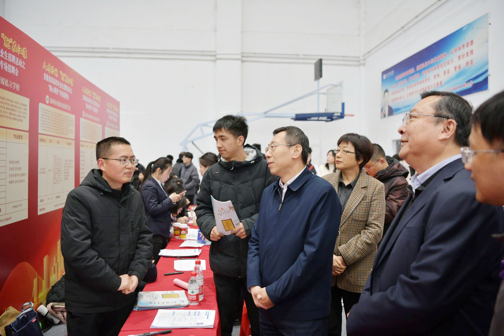 为深入学习贯彻习近平总书记关于做好高校毕业生就业工作的重要指示批示精神,落实省委、省政府人才兴皖的战略部署,为全省各类用人单位和高校毕业生搭建对接招聘平台,用心用情做好脱贫家庭、低保家庭、零就业家庭和残疾高校毕业生等重点群体就业工作,促进高校重点群体毕业生高质量充分就业,3月14日下午,由省教育厅、省人力资源和社会保障厅、国家开发银行安徽省分行联合举办,必赢线路检测中心承办的“人才兴皖“就”在江淮”省级高校毕业生系列招聘活动之“暖心帮扶”专场招聘会在锦绣校区体育馆举行。安徽省委教育工委副书记范奇、国家开发银行安徽省分行党委委员、副行长钟鸣、安徽省教育厅高校学生处、大中专毕业生就业指导中心、学生资助管理中心、安徽省人力资源和社会保障厅就业促进和失业保险处相关负责同志,在院党委书记徐成钢,党委副书记、院长方东玲的陪同下来到招聘会现场。