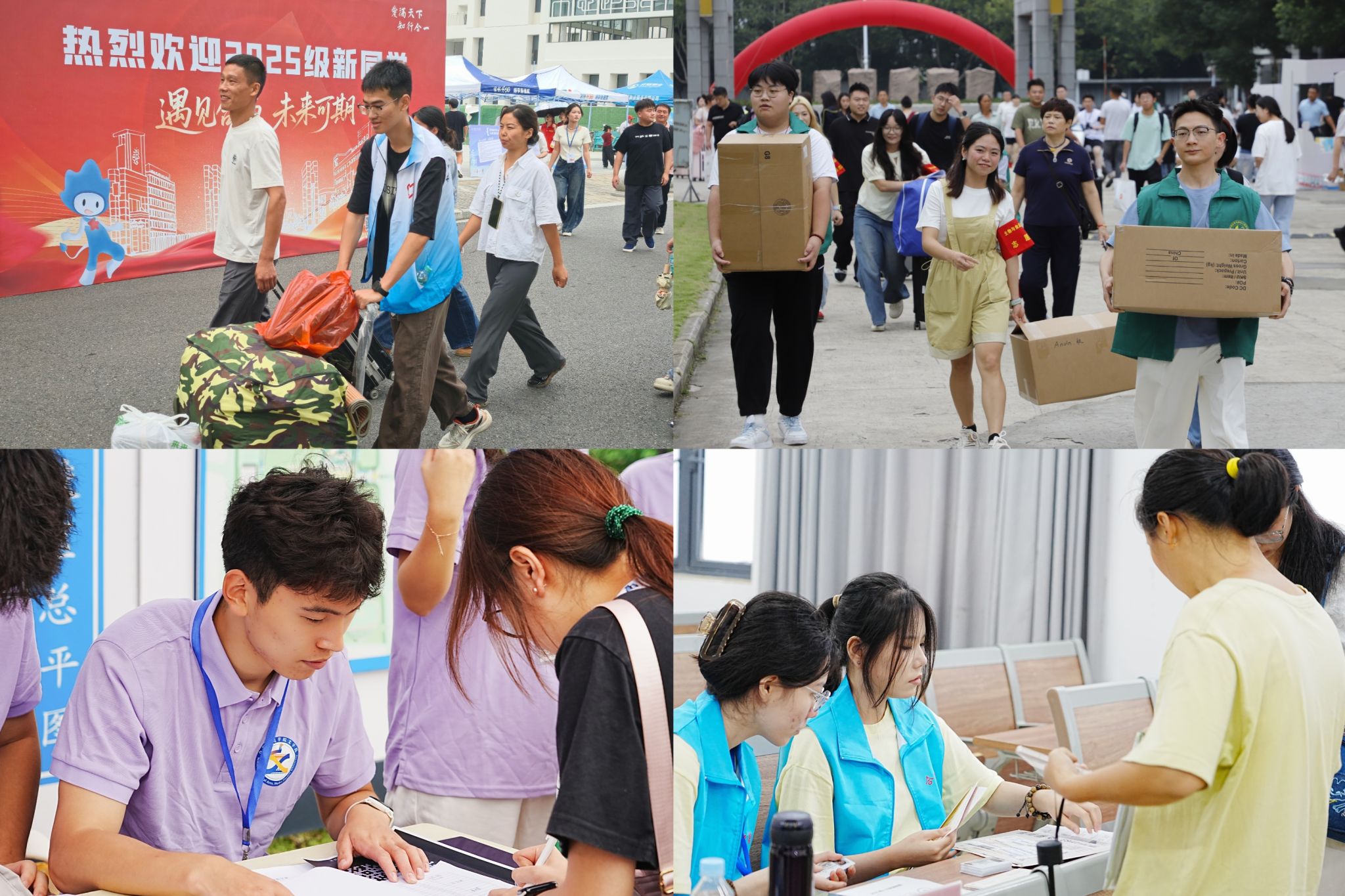 在这份跃动的青春热情背后,是一张由全校无数默默奉献者共同织就的护航网络。“你好,新同学!”清晨,在各大交通枢纽熙攘的人流中,身着红马甲的合师志愿者们穿梭其间,引导新生及家长们有序乘坐迎新大巴,成为迎接新生的“第一道风景线”;踏入校园,师生党员先锋队和志愿者们主动帮助新生和家长搬运行李、答疑解惑、介绍校园、合影留念,以实际行动彰显责任与担当。