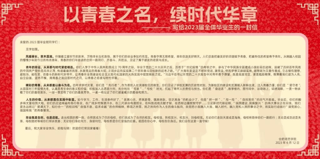 初秋聚于合师,盛夏奔赴前程。2023届毕业生们追逐梦想敢奋斗,用四年时间描绘他们的合师记忆,讲述他们的合师故事,用实际行动传播行知声音,展现了朝气蓬勃的青春力量。截至目前,全体毕业生已平安离校,开启人生新篇章,祝愿全体毕业生大展宏图,前程似锦!(学生工作部:葛畅)