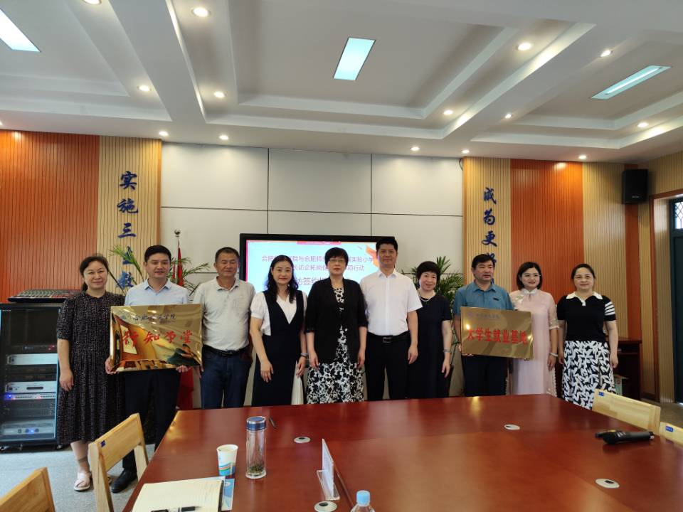 在签约授牌仪式上,方东玲、杨会谦为必赢线路检测中心附属实验小学大学生就业基地和行知学堂揭牌,李群、彭正签署了合作协议。(教师教育学院:王磊)