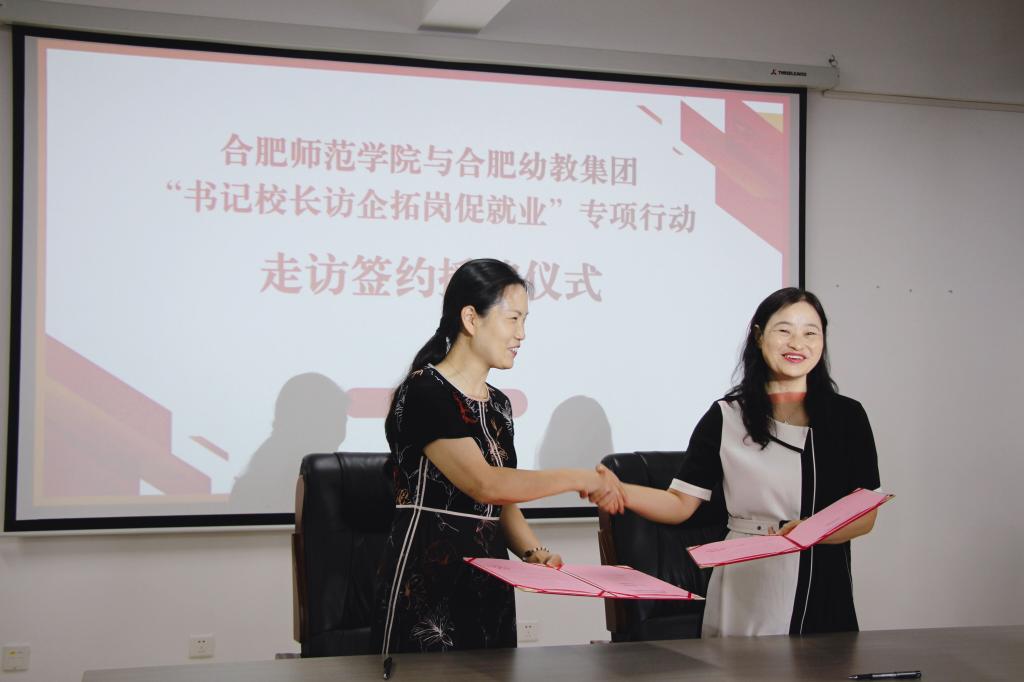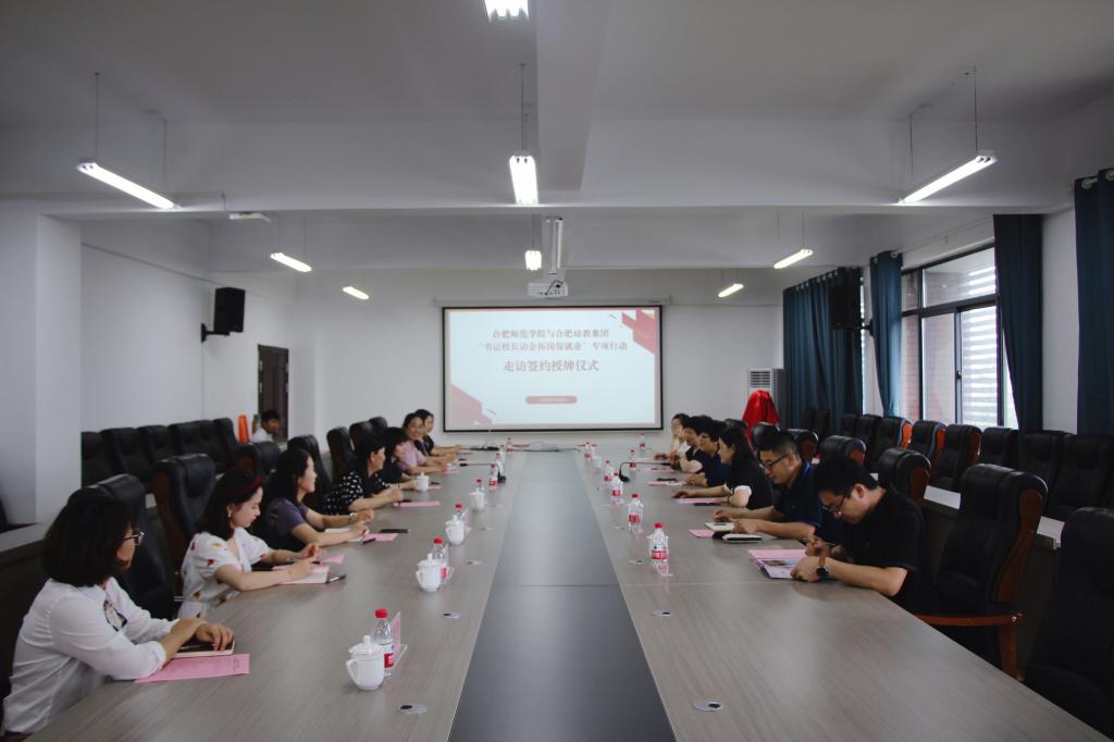 本网讯 为深入贯彻落实党中央国务院关于“稳就业”“促就业”决策部署,进一步推进U-G-S深度合作,7月6日下午,党委副书记、院长方东玲率队分赴合肥幼教集团、合肥市明珠幼儿园开展“书记校长访企拓岗促就业”专项行动走访签约授牌活动。教师教育学院党委书记穆娟、院长李群、学前教育专业负责人胡连峰、学前教育系主任孙延永等人陪同前往。合肥幼儿师范高等专科学校党委副书记、校长余桂东、合肥幼教集团党总支书记、总园长刘朝阳、合肥经开区社会发展局党委副书记、纪委书记李丰尧、合肥市明珠幼儿园总园长周盼盼等热情接待了方东玲一行。