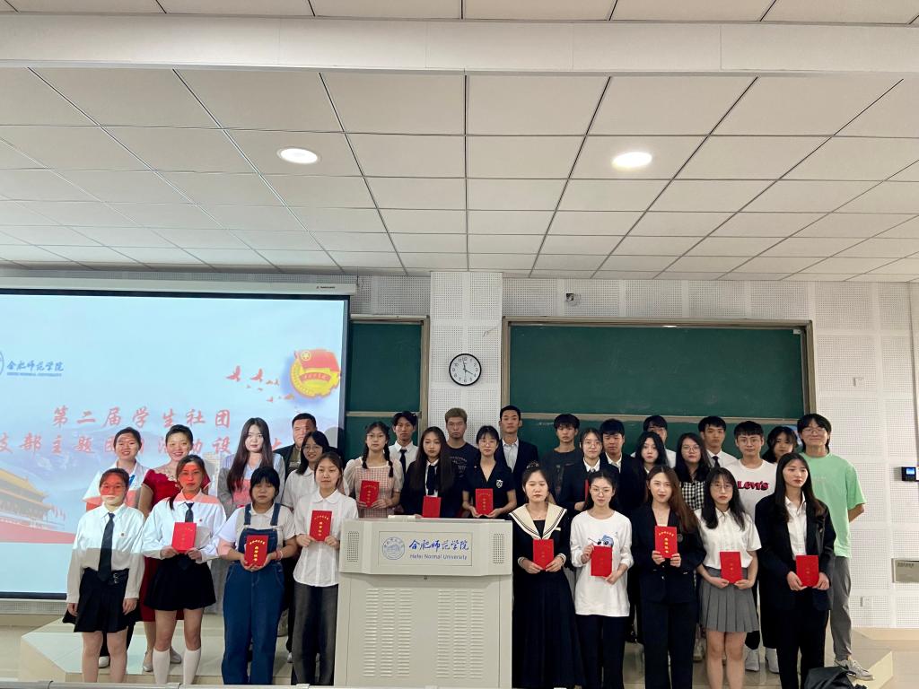 经过现场评委们的综合评判,大学生职业生涯规划与设计协会、心理协会荣获一等奖;绿色环保协会、梨花雨读书社、大学生英语协会、社会实践与思想政治理论研究会荣获二等奖;数学协会、S.K.Y街舞协会、羽毛球协会、法律志愿服务者协会、服装设计协会、营销策划协会荣获三等奖;大学生摄影协会、大学生观鸟协会、啦啦操社、大学生社交礼仪协会、模型与手工制作协会、大学生创新创意协会、Baker美食协会、封印动漫社荣获优秀奖。各评委老师为荣获社团团支部代表颁奖并合影留念。