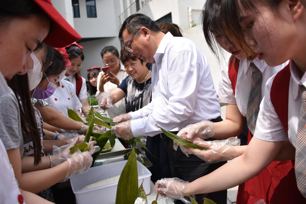 徐成钢为同学们发放了端午“香囊”,蕴含着防疫祛病、吉祥美好的寓意。随后,食堂工作人员提前把准备好的粽叶、糯米、枣子等材料整齐地摆放在桌子上。一旁的师生们跃跃欲试,食堂阿姨们化身“老师”,手把手地开始现场教学,传授包粽子的步骤和技巧。少数民族和汉族同学互相学习,不断摸索,一起完成,刚开始的时候有点手忙脚乱,包出的成品也大小不一、形状各异。在阿姨们的指导下,同学们越包越好,粽子也越来越“有模有样”。大家在欢声笑语中,不断感受民俗文化特色,体验传统佳节的独特魅力,在浓厚的节日气氛中,进一步加强了对中华民族、中华文化的认同。