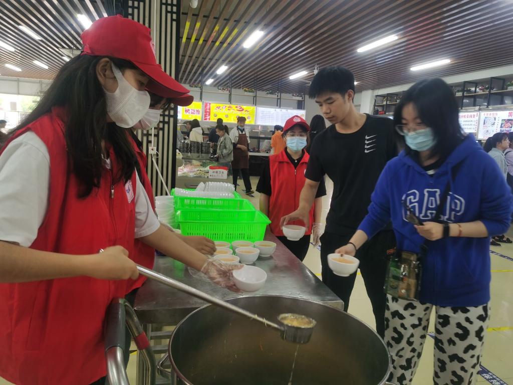 “大家分汤时小心翼翼,怕打多了烫到同学们,又怕打少了大家不够喝,尽力把每一碗汤都做到分配均匀。”物理与材料工程学院2020级光电信息工程与科学专业团支部陈玺衡同学在锦绣校区竹园餐厅负责拿碗为前来用餐的同学们打免费汤,同时另一位同学将打好的汤摆放在桌子上,大家分工明确,配合十分默契。