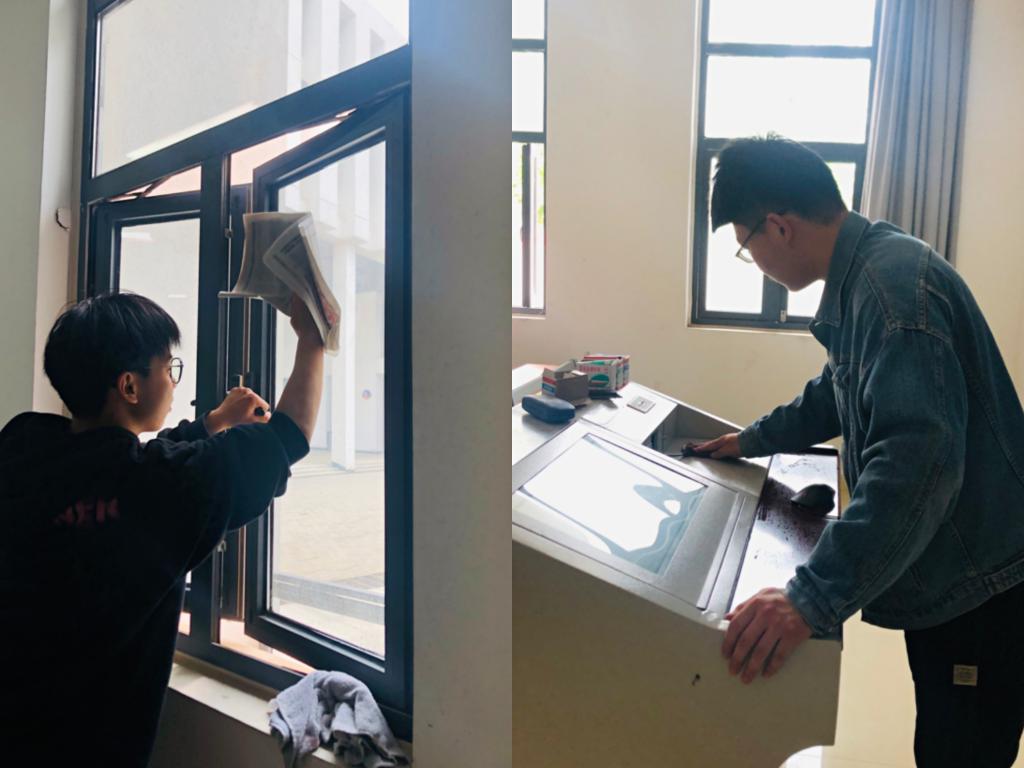 滨湖校区博学楼B107教室中,同学们拿出提前准备好的抹布、报纸等清扫工具行动起来。大家全身心地投入,热火朝天,充分展现了不怕脏、不怕苦、不怕累的优良品格,在打扫教室的过程中齐心协力、团结合作,大大提升了清扫效率。