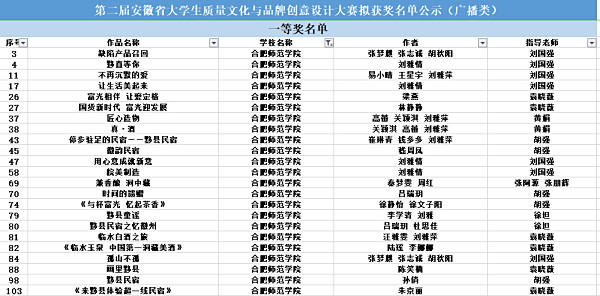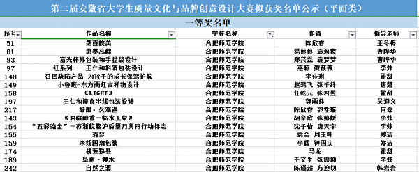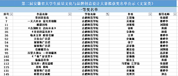 据悉,本项赛事由安徽省市场监督管理局、省教育厅、省文化和旅游厅、团省委共同主办,旨在为大学生搭建了参与质量教育和质量活动的平台,培养学生形成关注质量、追求卓越的价值观,引导学生参与到企业质量品牌创建的实践活动,鼓励学生将创意成果转化,激励学生积极投身“双创”。全省共有来自合肥工业大学、安徽大学、安徽师范大学、安徽财经大学、等60余所省内高校11000余件作品参赛。(教务处、艺术传媒学院、文学院)