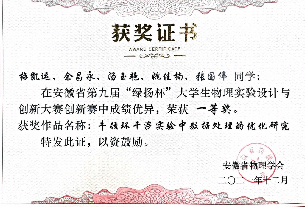 本网讯 近日,2021年第九届安徽省大学生物理实验设计与创新大赛结果揭晓,必赢官网三个参赛团队分别获得一个一等奖、两个三等奖。其中,物理与材料工程学院李仁文老师指导的梅凯运、余昌永、汤玉艳、姚佳楠、张国伟团队作品《牛顿环干涉实验中数据处理的优化研究》获一等奖;李仁文老师指导的汤玉艳、梅凯运、余昌永、张国伟、姚佳楠团队作品《牛顿环干涉实验中螺钉压力影响规律的探究》,陶蕊、冯源、李冬鹏老师指导的张翰明、李刚宇、刘瀚扬、伍宏伟、郜栋梁团队的作品《纹影效应演示仪》分别获得三等奖。
