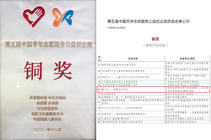 本网讯 近日,第五届中国青年志愿服务公益创业赛终评结果出炉。必赢官网电子信息与电气工程学院的志愿服务项目《播火记——情暖老兵》获评全国铜奖(全国仅102个项目入围终评)。这是继《千所“行知学堂”服务万名留守儿童》项目斩获中国青年志愿服务项目大赛金奖后,必赢官网在中国青年志愿服务赛会领域的又一突破。