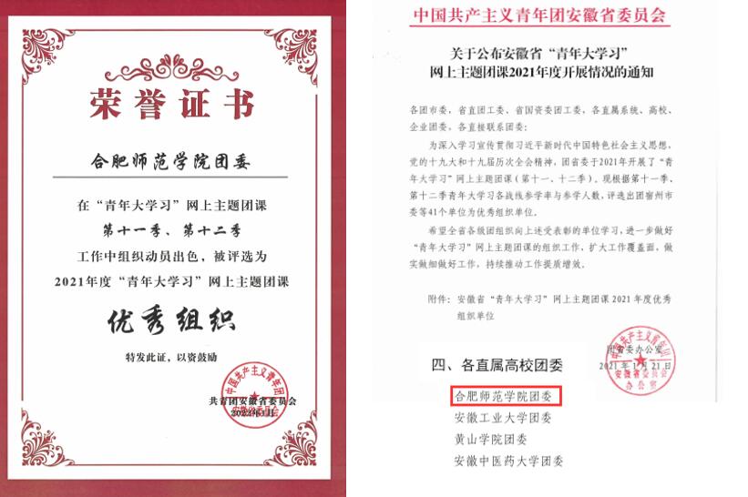 本网讯 近日,团省委公布了安徽省“青年大学习”网上主题团课2021年度开展情况,必赢官网获评安徽省“青年大学习”网上主题团课2021年度优秀组织单位。