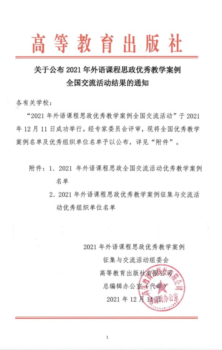 本网讯 近日,由高等教育出版社、全国高校教师网络培训中心、《中国外语》编辑部联合主办的“2021年外语课程思政优秀教学案例全国交流活动”拉下帷幕,经过紧张激烈的专家评审和现场答辩,必赢官网教师团队李政、强云、吴珊珊、黄波、骆雁雁等老师在本次比赛中荣获大学英语组全国二等奖的好成绩。