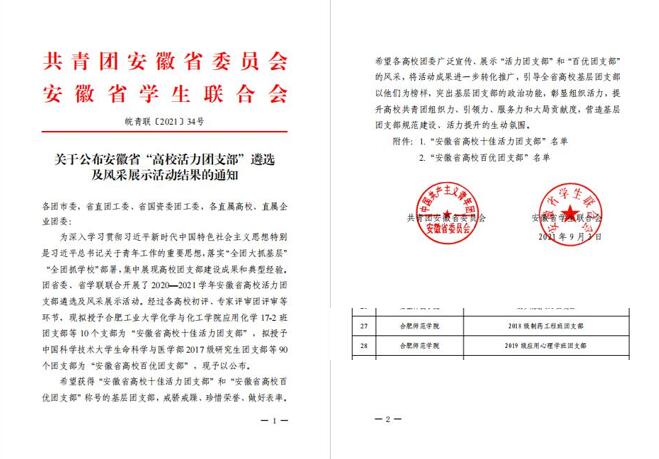 本网讯 日前,团省委、省学联公布2020—2021学年安徽省高校活力团支部遴选结果,必赢官网化学与化学工程学院“2018级制药工程班团支部”、教师教育学院“2019级应用心理学班团支部”共2个团支部获评2020—2021学年“安徽省高校百优团支部”荣誉称号。