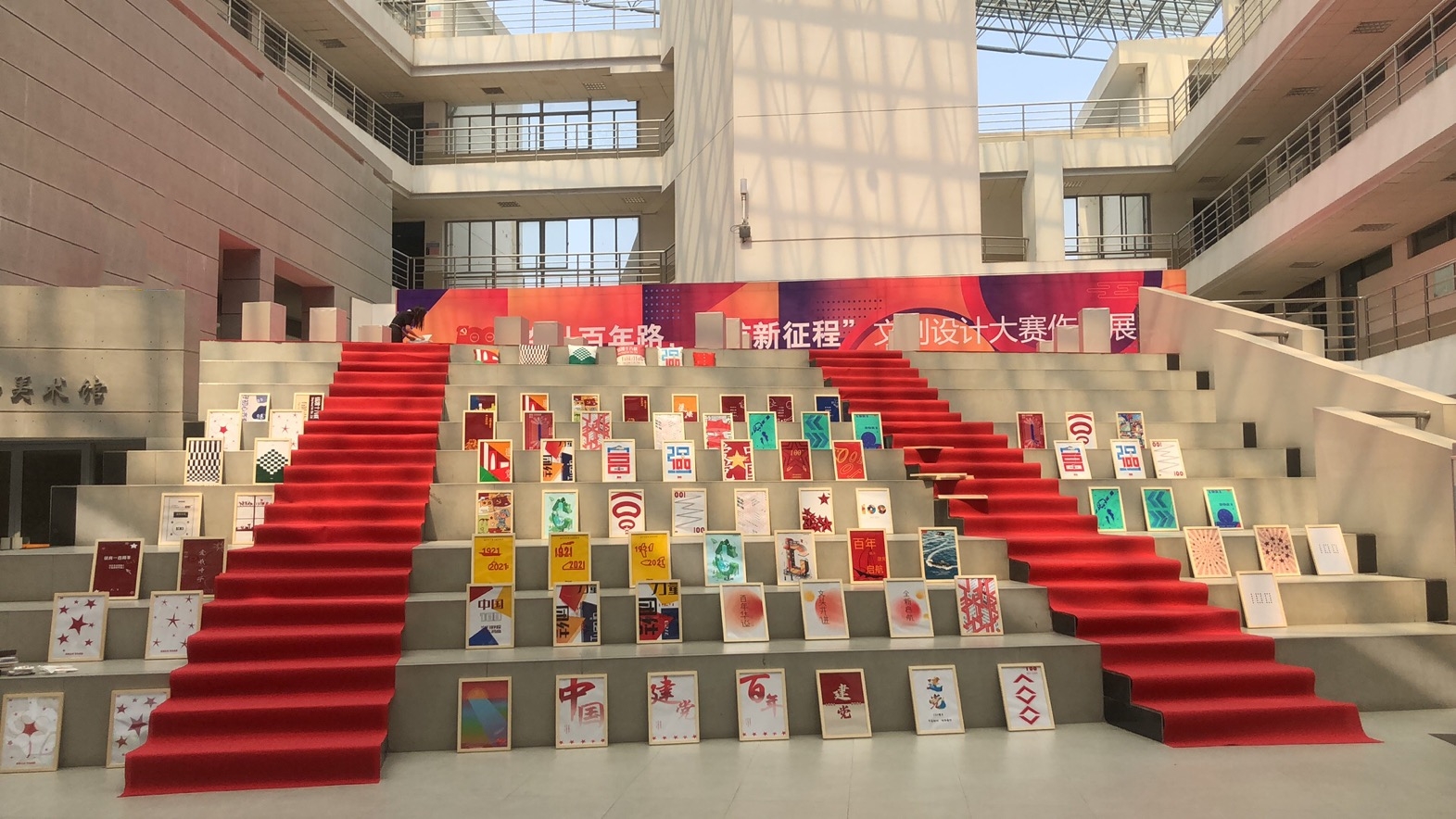 实体展从来自全校各个专业的700多张设计图200余组学生作品效果图中精选出38组优秀设计稿,生成各类文创实物200余个。阶梯展区部分展示的38组共计100幅设计稿,以及拾阶而上的参观路线设计,以艺术之美诠释了在中国共产党领导下中华民族实现从站起来、富起来到强起来的历史性飞跃。主平台展区部分展示的15组共计100件文创作品,涵盖了服装服饰、版画以及文创产品等多种艺术样式,体现了青年学子在艺术创作中深入学习党史、深入实践主题创作的时代内涵的鲜明特色。