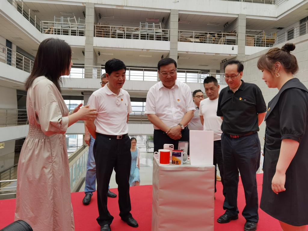 本网讯 为庆祝中国共产党成立100周年,展示中国共产党百年光辉历程、伟大成就和宝贵经验,在广大师生中传承红色基因、赓续共产党人的精神血脉,大力营造奋进新征程、创造新奇迹、展现新气象的浓厚氛围,由校党委宣传部、党委组织部,艺术传媒学院党委主办,艺术传媒学院分团委承办的“奋斗百年路 启航新征程”文创设计大赛作品展近日在艺术楼行知美术馆隆重展出。校党委书记徐成钢、校党委副书记吴昕春、副校长姚本先在校办公室、组织部主要负责人陪同下参观文创设计大赛作品展。