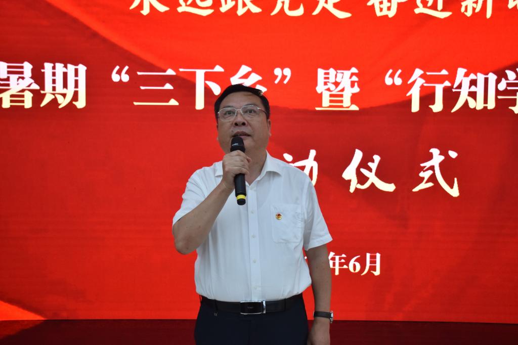 吴昕春发表讲话,指出暑期“三下乡”暨“行知学堂”实践活动一直是我校加强思想政治工作、打造行知文化特色、推进实践育人、深化青年志愿服务内涵建设的品牌活动,为学校广大学生了解国情省情,增强社会责任感,培育和践行社会主义核心价值观搭建了平台和阵地,受到基层群众和社会各界的广泛好评。他就开展好今年的活动提出三点要求:一要提高思想认识,突出活动主题。要紧紧围绕“永远跟党走,奋进新时代”的主题,切实提高思想认识,加强组织领导,结合实际情况,把党史学习教育的元素有效融入到活动全过程,让广大同学在参与活动中接受党史学习教育,厚植爱党爱国情怀。二要加强内涵建设,凸显品牌效应。要按照行知学堂基地化、标准化、专业化、特色化的“四化”建设目标,齐抓共管、群策群力,共同推进“行知学堂”的内涵建设,进一步凸显品牌效应。同时要积极组织广大同学按照就近就便的要求,参加“返家乡”等社会实践活动,在社会实践中受教育、长才干、做贡献、展风采。三要强化指导管理,落实安全责任。要强化底线思维,增强安全意识,始终把师生身体健康和生命安全放在第一位,严格执行当地疫情防控要求,依法依规组织各项实践活动。他希望同学们秉承“爱满天下、知行合一”的校训精神,用投身社会实践热潮的实际行动和丰硕的实践成果,庆祝中国共产党成立100周年。