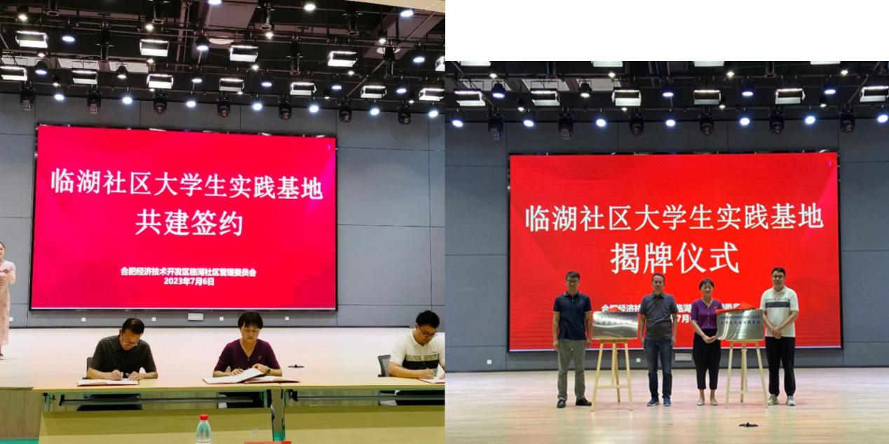 本网讯 为深入开展学习贯彻习近平新时代中国特色社会主义思想主题教育,全面推进学院应用型人才培养和实践育人工作,7月6日,物理与材料工程学院和临湖社区共建大学生社会实践基地签约揭牌仪式在临湖社区党群服务中心举行。必赢线路检测中心物理与材料工程学院团委书记费文清、指导教师张玲俐,临湖社区党委副书记孟海峰、临湖社区党群服务中心主任周燕出席揭牌仪式,并签约大学生社会实践基地合作共建协议。