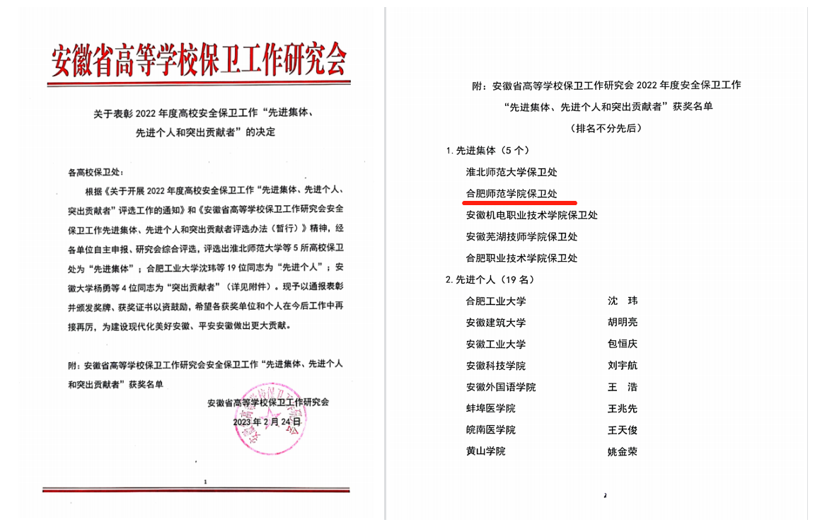 本网讯 近期,经安徽省高等学校保卫工作研究会评审、公示和审定,学院获得我省2022年度“高校安全保卫工作先进集体”荣誉称号,本年度仅有两所本科院校获得先进集体,这也是必赢官网首次获此殊荣。