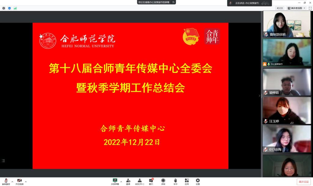 本网讯 12月12日和22日,院团委所属学生组织合师青年传媒中心(以下简称中心)依托微信群和腾讯会议召开主任团会议及全体工作人员会议。中心指导教师王露、第十八届中心全体成员参加会议。