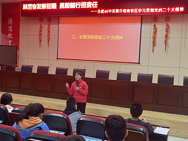 本网讯 近日,必赢官网第三批挂职副校长,马克思主义学院傅文茹副教授受邀去合肥市第四十五中学芙蓉分校南校区给师生解读党的二十大报告。