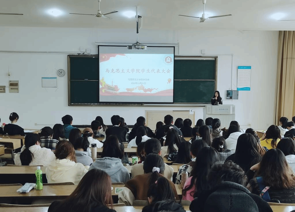 本网讯 11月21日中午,马克思主义学院第二次团代表大会和第二次学生代表大会于锦绣校区博约楼108召开,由2021级思想政治教育班赵璟丽主持。辅导员王萌、各年级学生代表、部分学生会成员出席此次会议。
