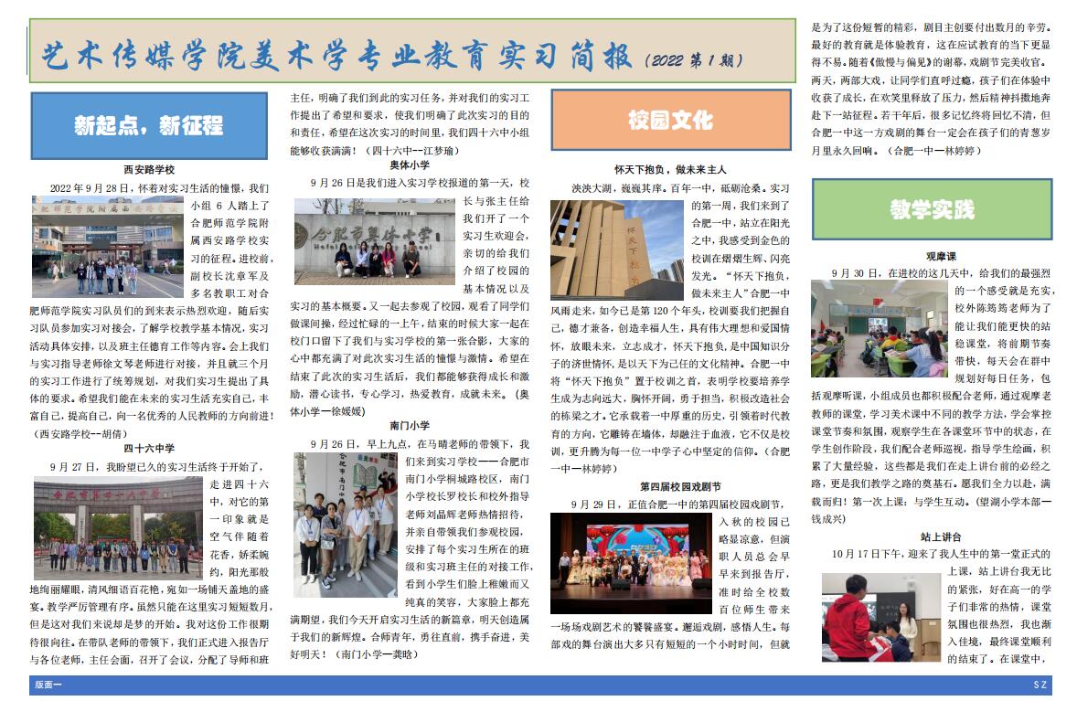 三年来,艺术传媒学院不断改革管理方式,研制管理工具,提高教育实习管理实效和实习质量,特别是“以报代管”的方式,使学院能够全过程全方位对实习进行指导,能全面全程展示实习成果,成为学生交流实习心得的原地,发表小论文的平台。学院要求优秀实习生重要条件之一是要么写过报道要么被报道过,所以简报也成为了评选优秀实习生的重要“物证”。
