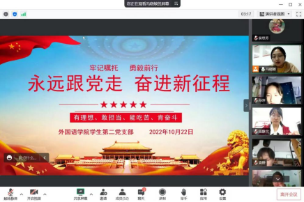 本网讯 为引导学生认真学习党的二十大精神,坚定不移听党话、跟党走。10月22日,外国语学院学生第二党支部通过腾讯会议召开线上专题学习会,围绕党的二十大报告进行学习交流,会议由外国语学院学生第二党支部书记冯晓敏主持。