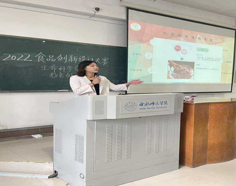 本次比赛分为包装设计组和产品设计组,参赛的16组作品中推选前8组参加省食品创新大赛。为保证比赛的专业性以及公平公正性,比赛作品采取抽签顺序和匿名汇报。作品内容十分丰富,有糕点、有面食、有饮口、有果酒等,选手们通过演讲和PPT展示,并结合实物产品演示和试尝来讲述他们产品的设计理念、产品的制作工艺流程、产品的营养价值和产品的创新之处。