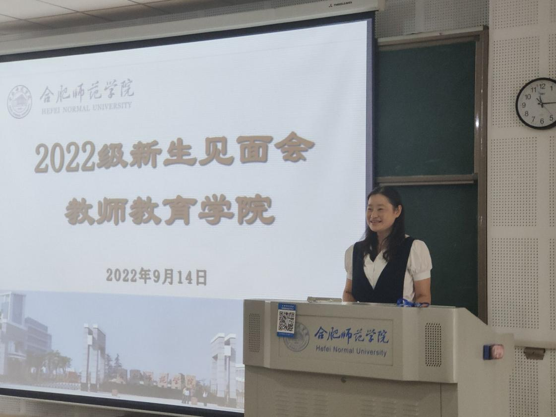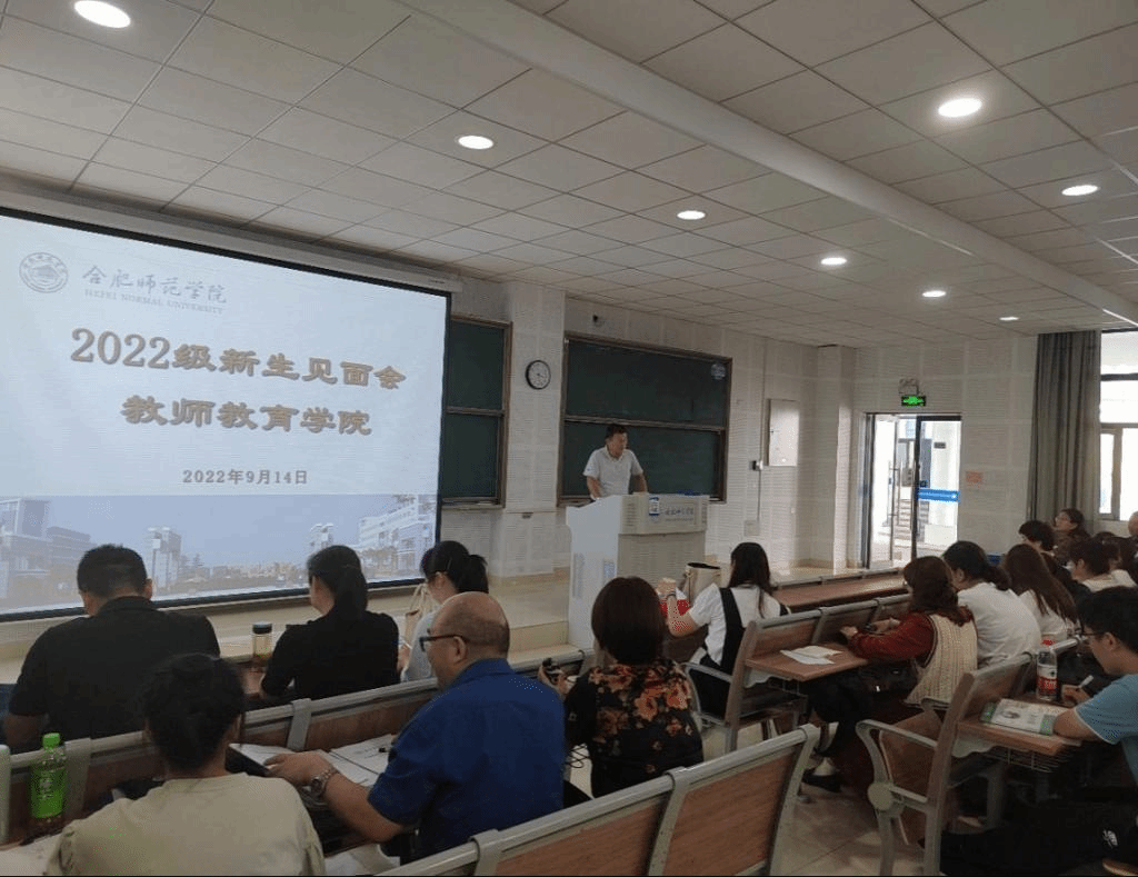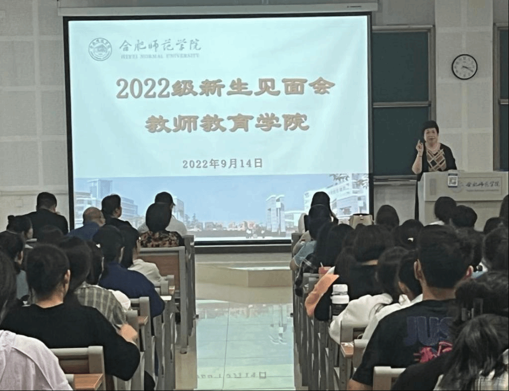 本网讯 9月14日下午,教师教育学院在滨湖校区博学楼A108举行了2022级新生开学典礼。教师教育学院党委书记穆娟、院长李群、副院长闫龙、教育系主任汪昌华、心理系主任吴桂翎、学前系专业负责人胡连峰、主任孙延永、分团委书记王磊、辅导员唐淼、胡蝶出席见面会,2022级全体新生参加,会议由闫龙主持。