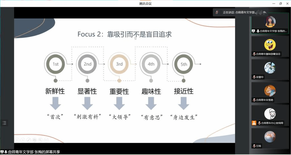 合师青年传媒中心成员张梅传达并转训了全省教育宣传工作培训班内容。结合实际案例,从新闻策划与写作、新媒体选题及运营、校园媒体学生干部职责与素养等方面作新学期校园媒体学生干部业务培训。