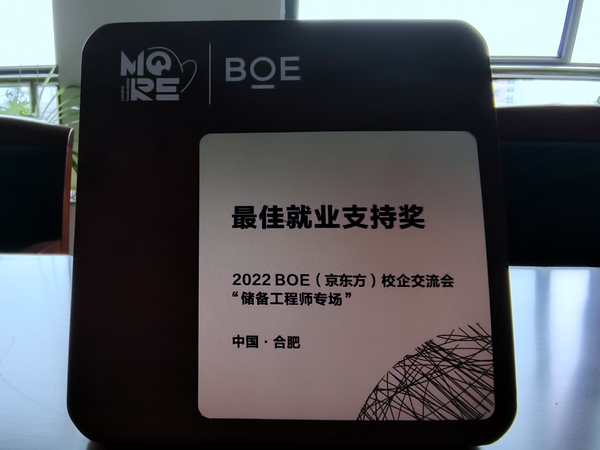 本网讯 为进一步提升学院就业工作服务质量和服务效能,深化校企合作,8月22日,物理与材料工程学院副院长訾振发、党委副书记吴震、电子信息与电气工程学院副院长范程华、光电信息科学与工程专业负责人余龙宝、就业创业工作处创业管理服务科科长何晶晶一行应邀参加京东方科技集团股份有限公司在合肥举办的“2022 BOE(京东方)校企交流会-储备工程师专场”,与企业高管、人力资源负责人、兄弟院校代表一起探讨校企合作模式创新、高校人才培养。作为高校优秀代表,学院获颁京东方集团“最佳就业支持奖”荣誉称号。
