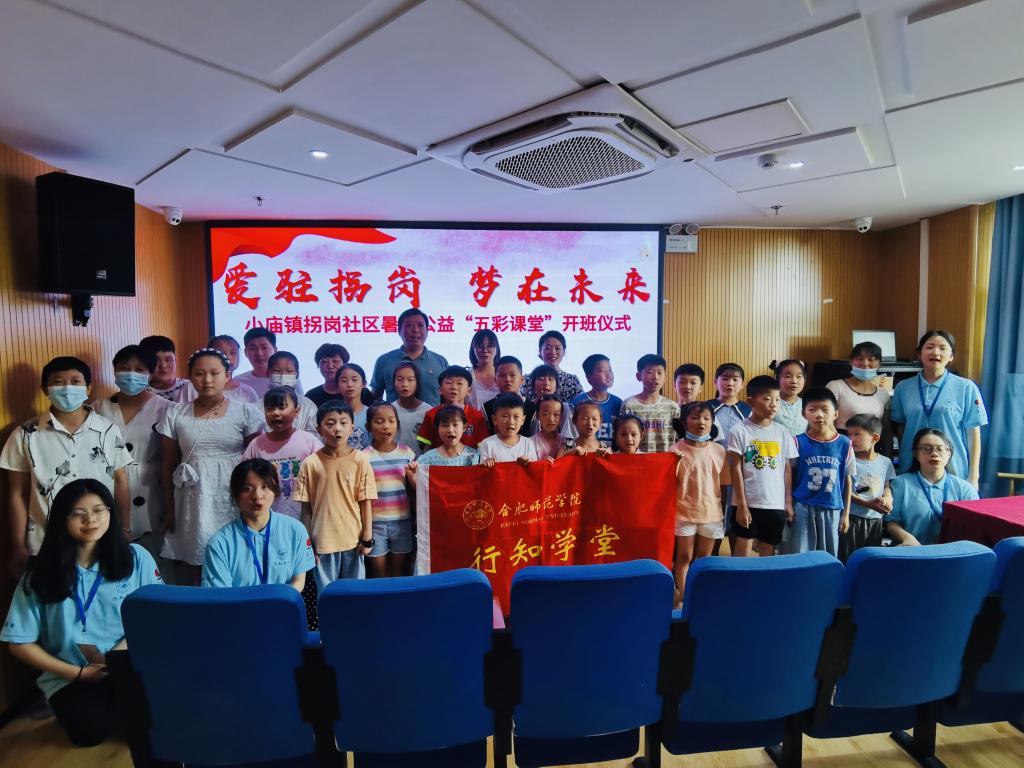 7月7日,合肥市蜀山区小庙镇拐岗社区行知学堂举行开班仪式暨小学员家长见面会。小庙镇党委分管、妇联、文明办等负责人、拐岗社区党委书记余建军、院团委社团管理部副主任姚瑶和全体“小先生”、小学员及学员家长参加开班仪式。