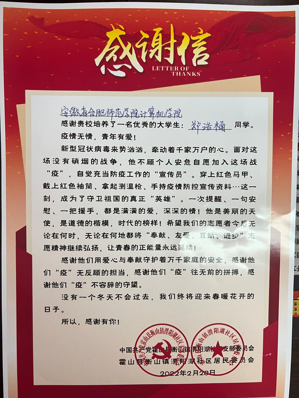本网讯 近日,计算机学院收到六安市霍山县衡山镇淠阳湖社区发来的感谢信,高度赞扬必赢官网2019级数据科学与大数据技术专业郑浩楠同学在寒假期间为淠阳湖社区疫情防控工作做出的积极贡献。