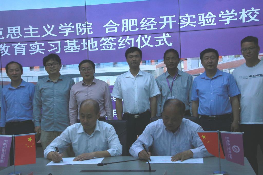 本网讯 5月6日下午,马克思主义学院副院长陶有浩、党总支组织员束道锋、周继祥副教授和魏兵副教授前往合肥经开实验学校参加双方共建实践教学及就业基地签约揭牌仪式。合肥经开实验学校党支部书记、校长邵忠德,副校长李根华,副校长刘洋,校长助理陈薯方,校长助理梁贺,校长助理郝伟等参加了签约揭牌仪式。