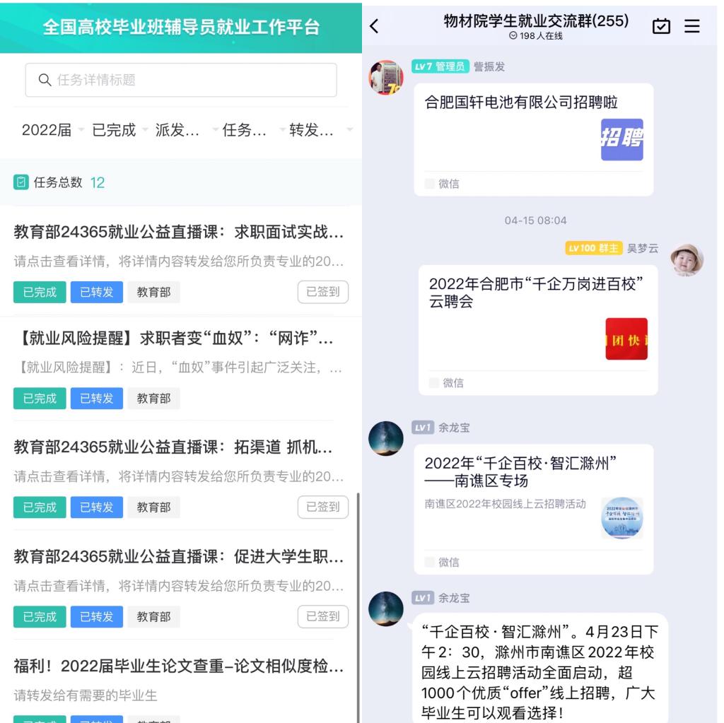 学院充分利用国家24365大学生就业服务平台,动员全体毕业生在平台注册并关联毕业班辅导员,由毕业班辅导员讲解平台使用方式并及时推送相关政策。此外,学院自2018年以来便成立了“物材学院就业交流群”,学院分管就业的领导、系主任、专业教师、辅导员均在群里及时推送就业创业政策及招聘信息,提供就业服务,做到精准帮扶。