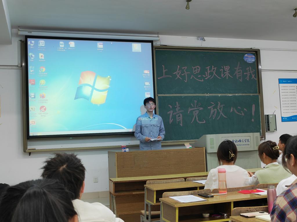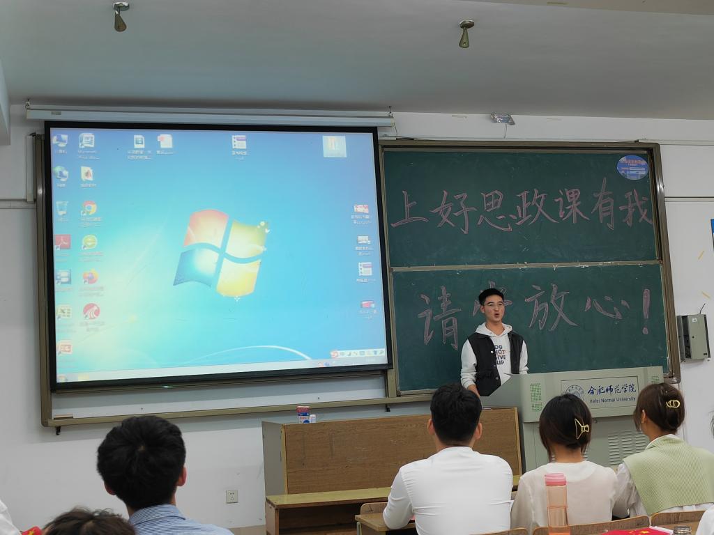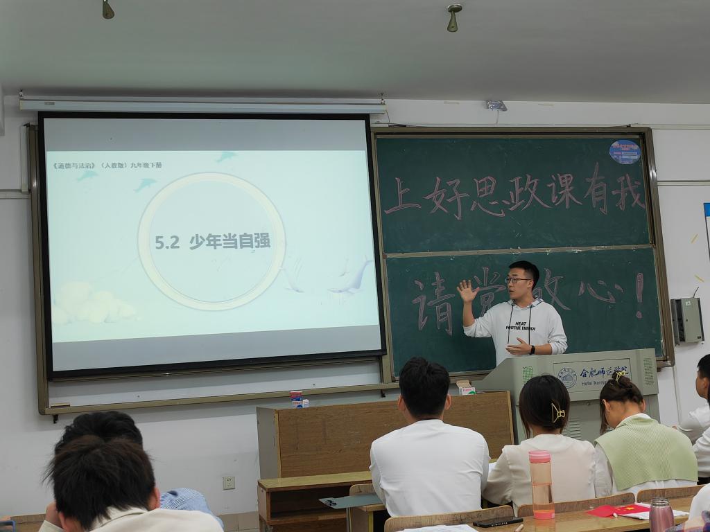 2021年获得安徽省大学生服务外包创新创业大赛一等奖和“田家炳杯” 第七届全国师范院校师范生教学技能竞赛决赛一等奖的2019级陈玉钊同学给大家展示了一场生动的思政微课——“少年当自强”,陈玉钊以独特的教学设计理念、激情的课程讲授和热烈的现场互动,让同学们切身感受到做一名优秀思政课教师的魅力和活的思政课的说服力和针对性。