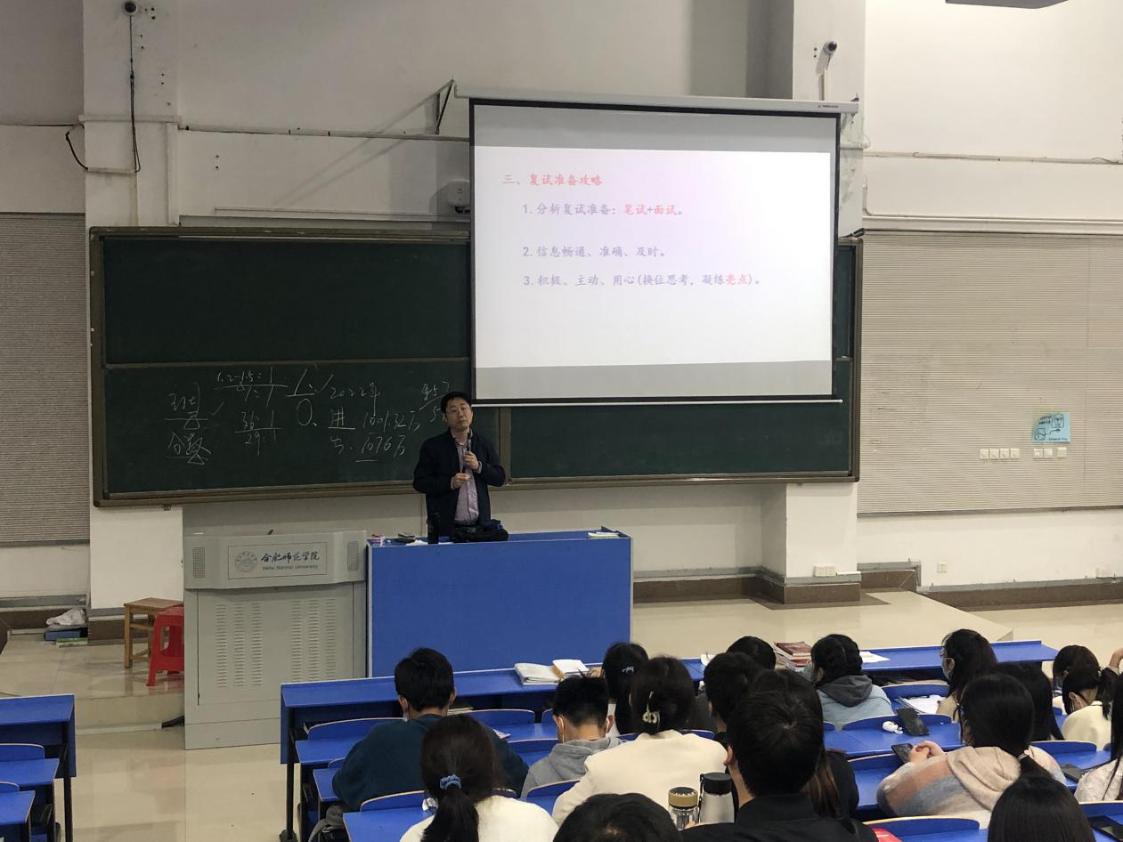 王占军老师具有多年招录硕士研究生的工作经验,他结合近5年研究生报录比以及报考研究生人数不断增长的趋势对2022年考研形势进行了分析;讲述了往届学生考研情况,用具体事例告诉考生如何依据自身实际情况选择调剂还是二战;重点详细介绍了考研复试技巧,从面试和笔试两方面剖析备考注意事项,提醒同学们在面试前积极丰富自己的个人简历和科研经历,锻炼外语能力,面试过程中保持自信自强,充分展示自己在大学学习和实践中的亮点成果。最后王老师用自己最喜欢的电视剧《亮剑》的剧照,鼓励考生在这个阶段亮出自己的闪光点。