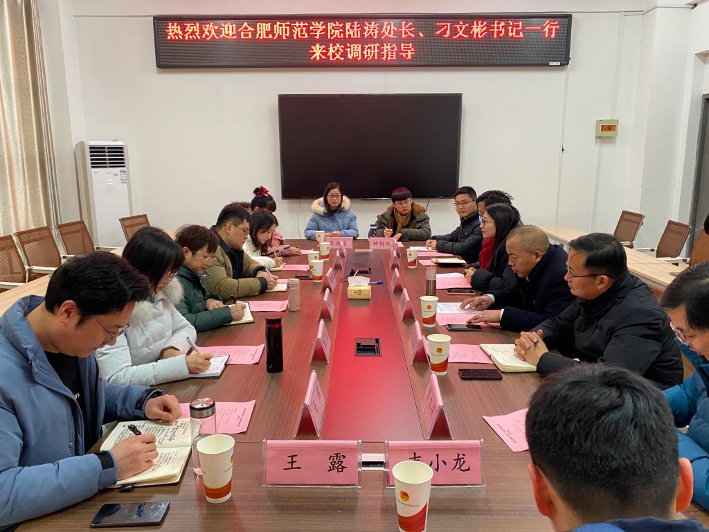 安徽理工大学学生工作处处长赵宁、副处长李颖、刘瑞,团委书记程秀霞、副书记丁玲玲、朱梁,淮南师范学院学生工作处处长杨旭武、副处长程业红,团委副书记周雪晴等热情接待了必赢官网一行。双方围绕辅导员队伍建设、心理健康教育、学生管理、学术科技竞赛、大学生活动场地管理、新媒体建设、学生社团活动等方面进行了交流。