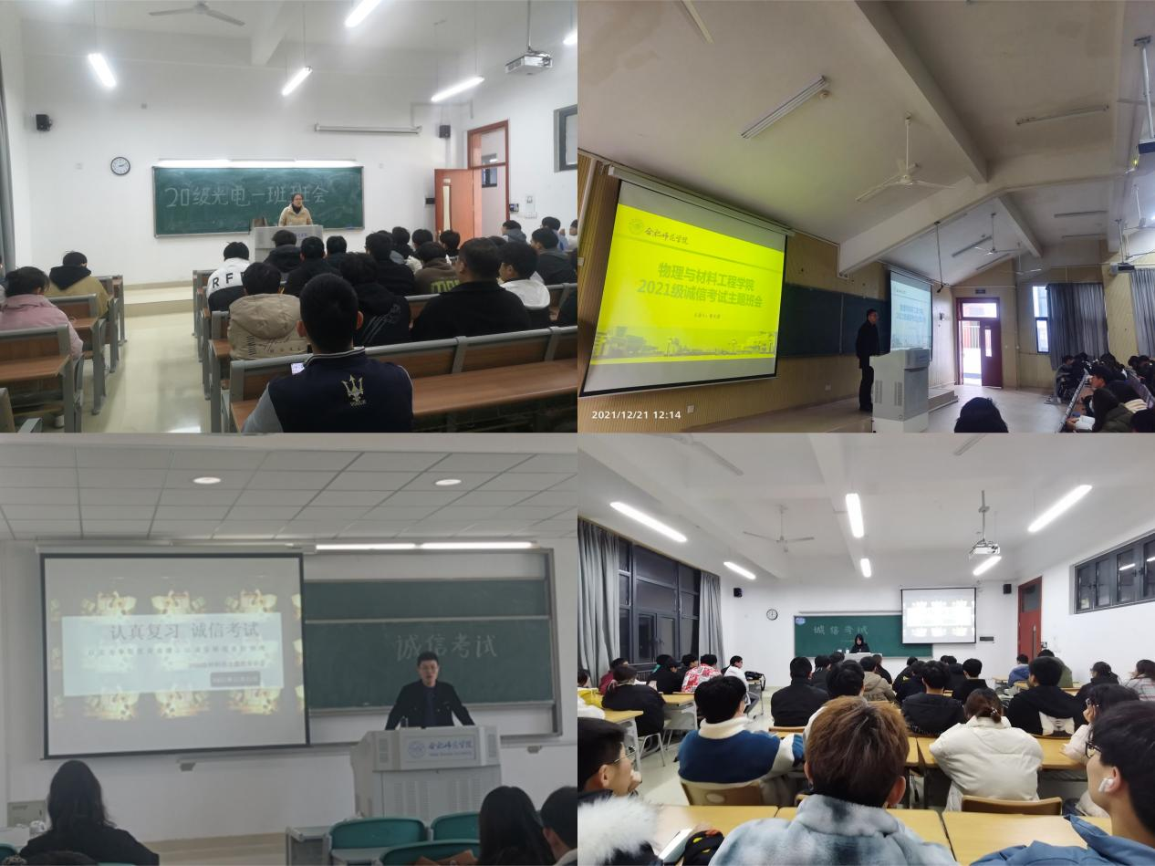 本网讯 期末考试临近,为进一步端正考风,严肃考纪,培养学生的诚信意识与素质,营造良好的学习氛围。12月20日-23日,物理与材料工程学院各年级各班分别在锦绣和滨湖两个校区召开了诚信考试教育主题班会。