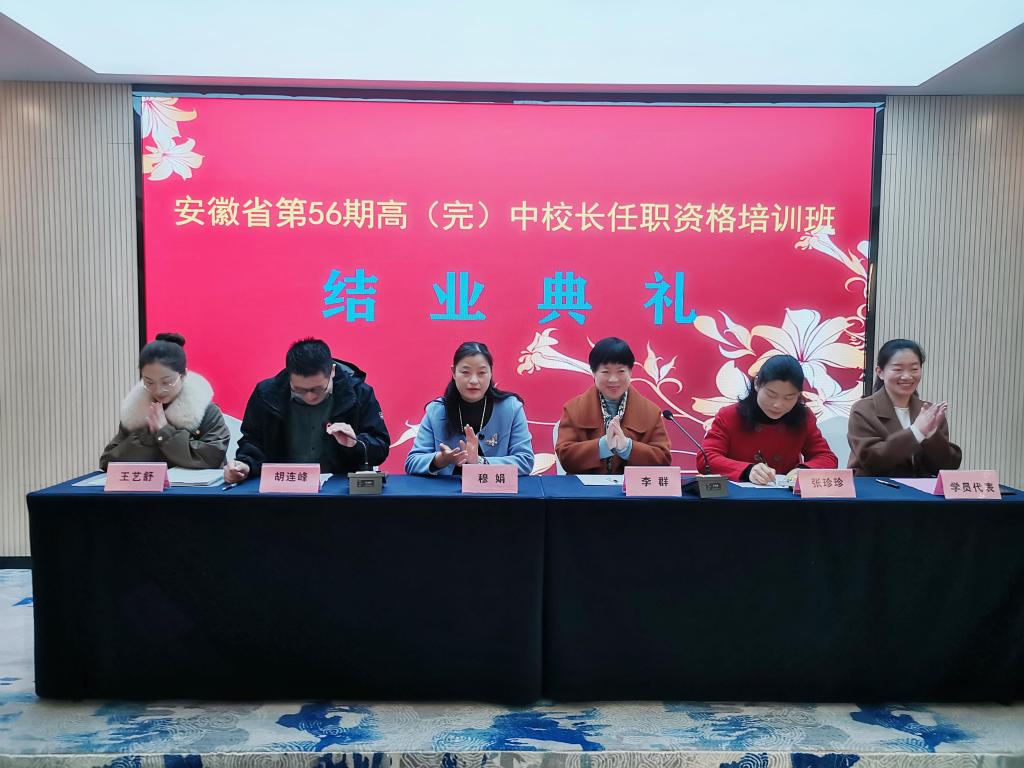 本网讯 12月7日上午,教师教育学院承办的安徽省第56期高(完)中校长任职资格班在合肥市曼斯顿酒店举行了结业典礼。教师教育学院党委书记穆娟、院长李群、干训部主任胡连峰、班主任张珍珍,学生助理王艺舒以及来自全省各地73位校长班全体学员参加了结业典礼,典礼由胡连峰主持。