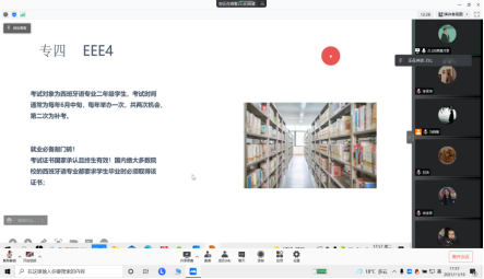本网讯 为帮助学生掌握专业四级考试备考方法,明确学习任务和努力方向,11月11号—16号,外国语学院分别组织召开英语专业四级考试和西语专业四级考试线上经验分享会,共234名学生参加此次分享会,会议由2020级辅导员冯晓敏主持。