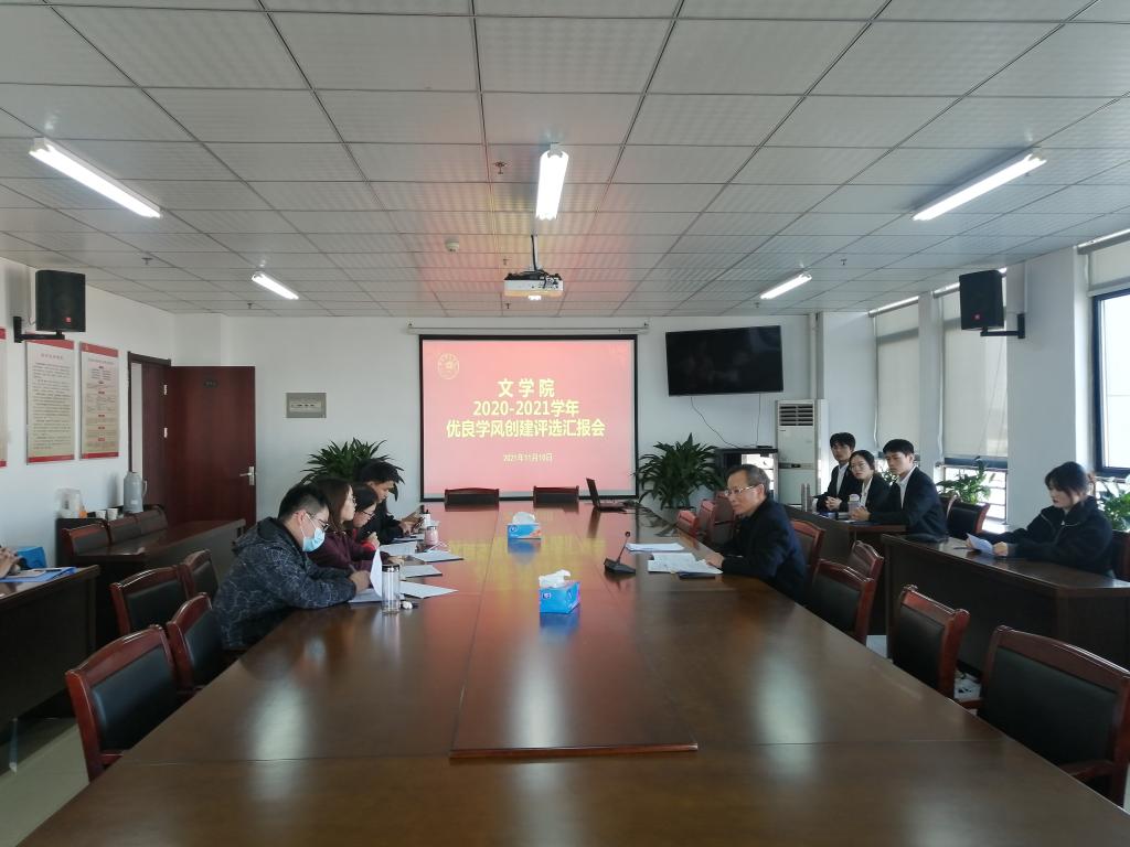 本网讯 为进一步加强必赢官网的学风、班风建设,全面激发学生自觉学习、奋发进取、立志成才的积极性,不断增强学生成长成才的动力,提高人才培养质量。文学院于11月10日在锦绣校区行知楼802会议室成功举办2020-2021学年优良学风创建评选汇报会,出席本次会议的有文学院党委书记李旺生、党委副书记陈好、各年级辅导员以及各班级学生代表。