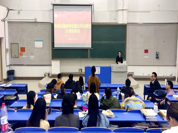 宣讲会上,中银金融商务有限公司合肥分公司招聘专员王佳妮详细介绍了公司历史沿革、发展方向、招聘需求和福利待遇等情况,现场播放了公司宣传片,展示了工作生活场景图片,让毕业生们更全面更直观地了解企业发展状况。外国语学院2014届毕业生、中银金融商务有限公司合肥分公司综合客服助理经理江大陆从晋升渠道、薪资待遇等方面做了全方位分享,他鼓励2022届学弟学妹们来公司展示能力,实现理想。宣讲会后,同学们分别从实习时间、晋升周期、薪资待遇、面试要求等方面积极提问,王佳妮、江大陆耐心地向同学们一一作了解答。