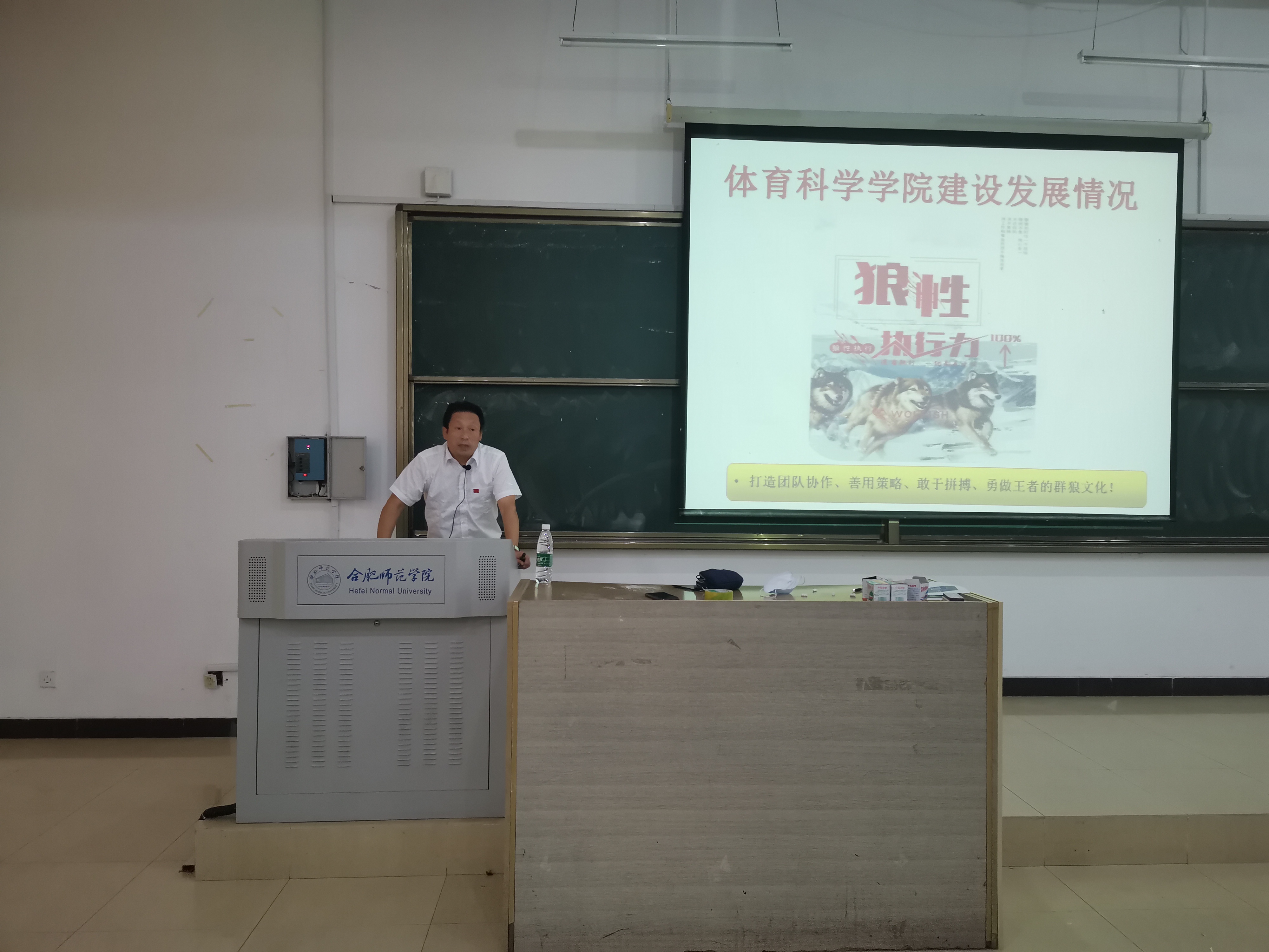 本网讯 沐浴金秋暖阳,踏上梦想征程。9月5日下午14:30,体育科学学院在博约楼101教室举行2021级新生见面会暨新生入学教育,共同翻开梦想起航的新篇章。体育科学学院党政领导班子成员、各专业负责人、全体教师及2021级全体本科生和研究生参加。新生见面会由体育科学学院副院长黄武胜教授主持。