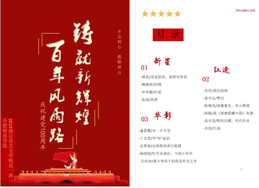 紧扣“用心学史、用情领悟、用笔记录、用力落实”的编纂初衷,文学院党委高度重视,2019级汉语言文学(师范)1班、2班班刊编委会在辅导员郝嘉乐老师的指导下,经过选题、组稿、审稿、编校、封面设计、出版等一系列环节,历时两月有余,完成党史学习教育专题班刊。自征稿以来,班级同学积极响应,成刊共收录作品27篇,内容包含党史学习教育感悟、树立理想信念、自强立志成才、革命书籍影片观感等丰富内容。