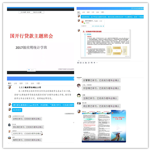 组织召开毕业班线上主题班会。鉴于目前毕业班学生多数在校外就业的情况,毕业班通过班级QQ工作群召开线上主题班会。班会上各毕业班辅导员按照要求主要落实了以下三项工作。一是上好资助政策“两节课”。针对直接就业的获贷毕业生,上好毕业确认流程讲解课,对毕业确认、提前还款办理、就学信息变更办理还款流程等进行详细讲解。针对继续攻读学位的获贷毕业生,上好下一学段资助政策宣讲课,解决了家庭经济困难学生进入下一阶段学习的后顾之忧。二是会上各毕业班辅导员组织学生自行观看了助学贷款宣传片、宣传手册PPT等,引导学生更加了解国家资助政策。三是通过召开诚信主题班会,提高学生对诚信感恩、责任担当的理解和认识,引导学生树立诚信和自立自强意识,增强责任担当。