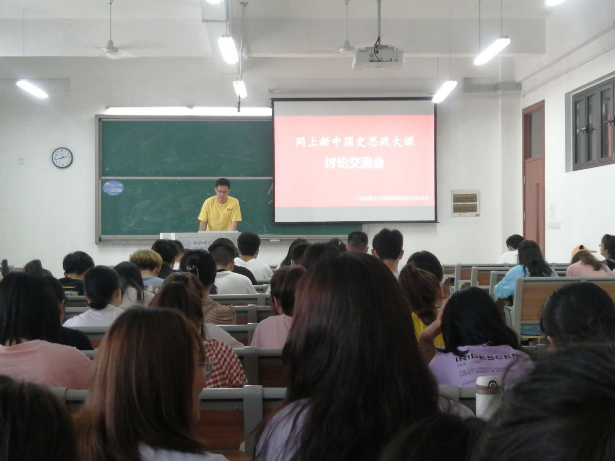 同学们认真观看并进行相关的记录。在集中观看后,各班班长组织同学们进行交流讨论,同学们认真参与、各抒己见。其中,2020级计大宇同学说道:“中华民族伟大复兴仍在路上,历史的先行者用他们的精神、血肉筑起了进步的阶梯,乘坐在历史高速列车上的我们,没有停息的理由,只有不断前进、勇于奋斗,不忘初心,牢记使命,才无愧为中华民族的儿女,国强我耀。”2019级何文涛同学说道:“历史是最好的教科书,知史爱党,知史爱国。知道我们党的艰辛历程,更让人坚定党的领导。中国共产党的出现,让中国人有了主心骨,古老中国展示出勃勃生机。党用行动来证明自己是最忠诚的,是最捍卫中华民族利益的。让中国人挺起胸膛,站了起来。没有共产党,就没有新中国。”2017级杨俊同学说道:“这一堂思政大课让我对新中国的历史有了更深刻的认识,作为新时代的青年,我会继续努力,为社会贡献自己的力量。”