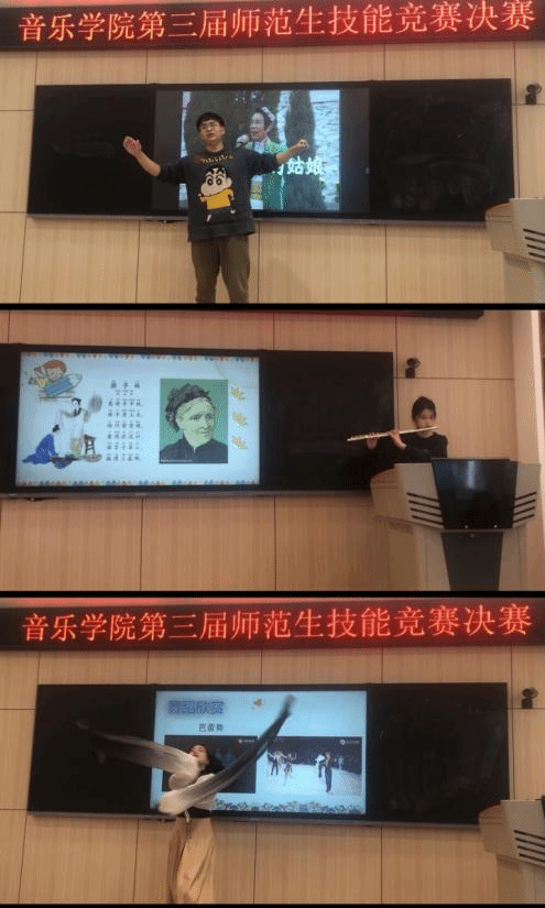比赛中,由于部分选手首次进行有生上课,有些许紧张,台下的“学生们”及时回应互动,缓解“老师们”的紧张情绪;有的选手准备充分,展现了器乐与舞蹈等个人才艺,教学内容丰富多样;还有同学可以实现“脱稿”讲课,自信满满,充分发挥出自己的长处。
