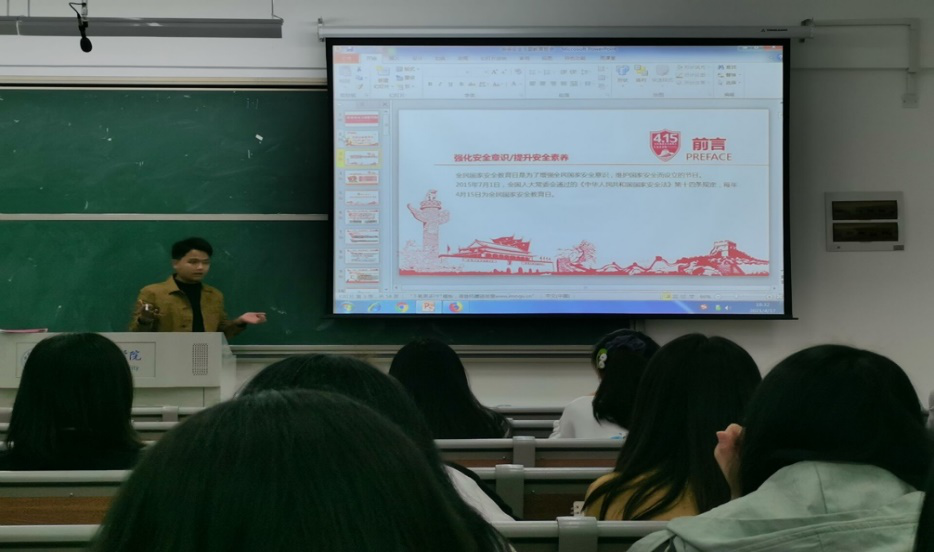文学院辅导员李惠恩于4月15日在滨湖校区铭传楼B303教室召开了春季安全主题教育会,会议召集了文学院各班班干和寝室长。李惠恩与同学们展开“同上一堂课”活动,共同了解国家安全知识,还列举了危害国家安全的犯罪实例,强调了维护国家安全的重要性。
